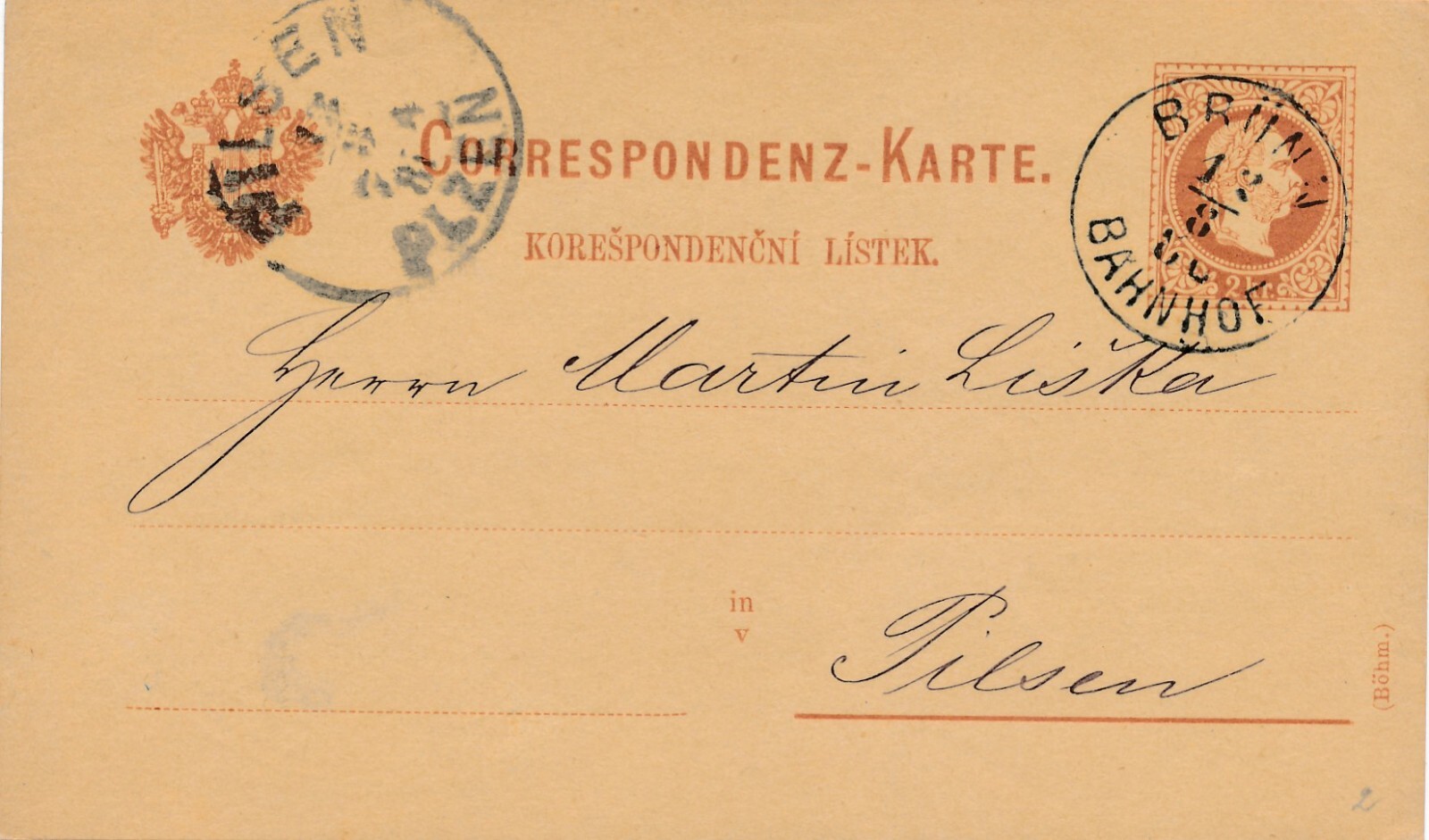 2 Kreuzer - Ganzsachen - Karte 1880 aus Brün Bahnhof (10052)