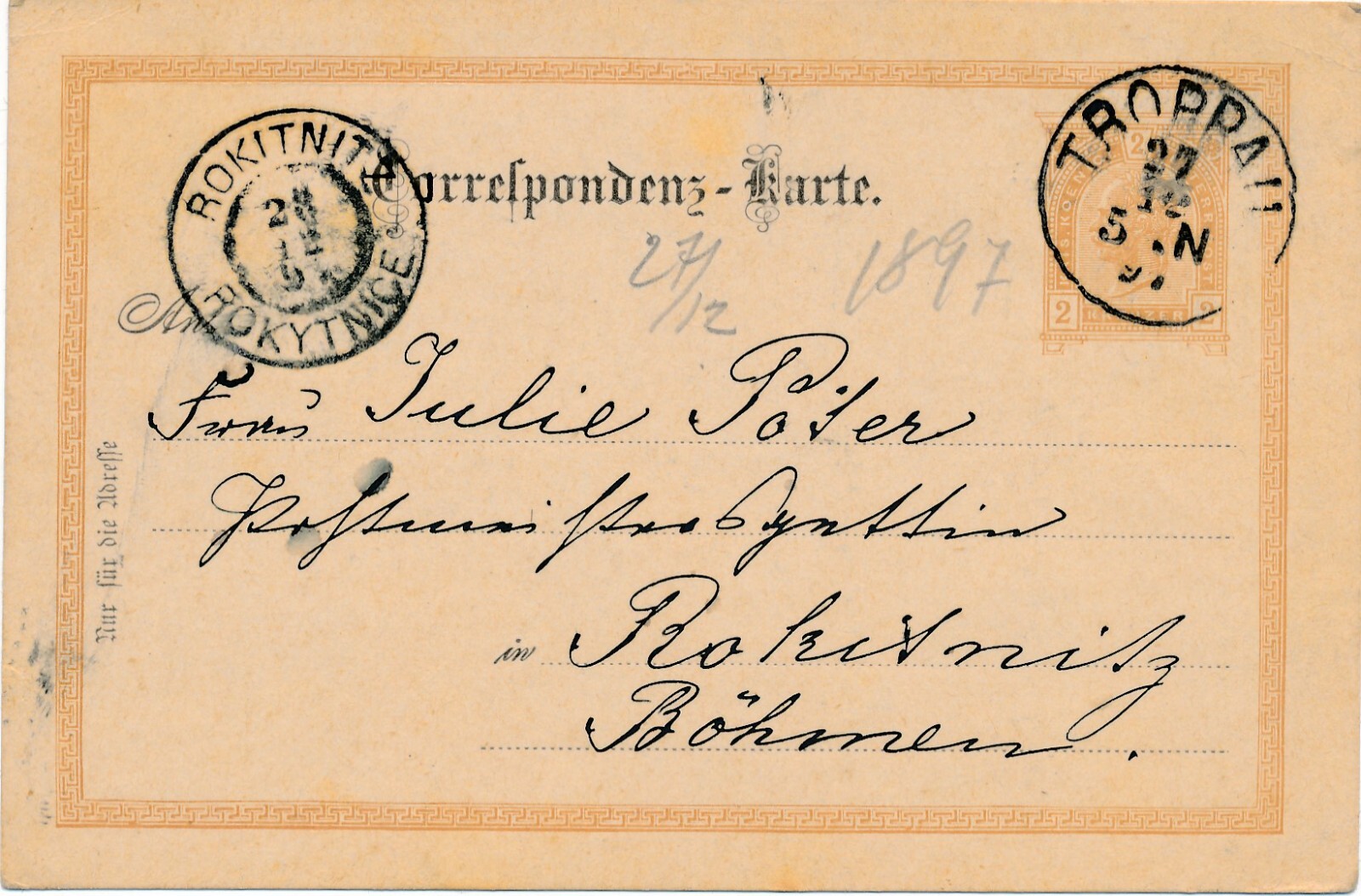 2 Kreuzer - Ganzsachen - Karte 1897 aus Troppau (10698)