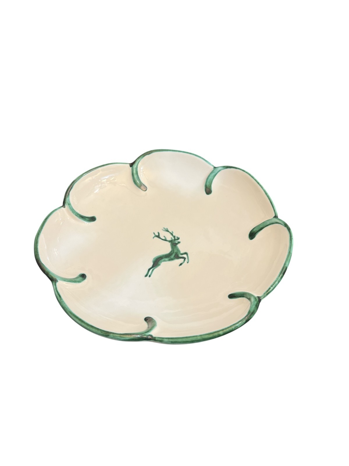 Ein eleganter Klassiker aus österreichischer Handwerkskunst: Dieser Obstteller von Gmundner Keramik besticht durch sein cremeweißes Design mit grünem Rand und dem ikonischen springenden Hirschmotiv in der Mitte. Die geschwungene Tellerform mit sanft gewelltem Rand verleiht dem Stück eine besondere Note – ideal für festliche Tafeln oder als stilvolles Sammlerstück.
