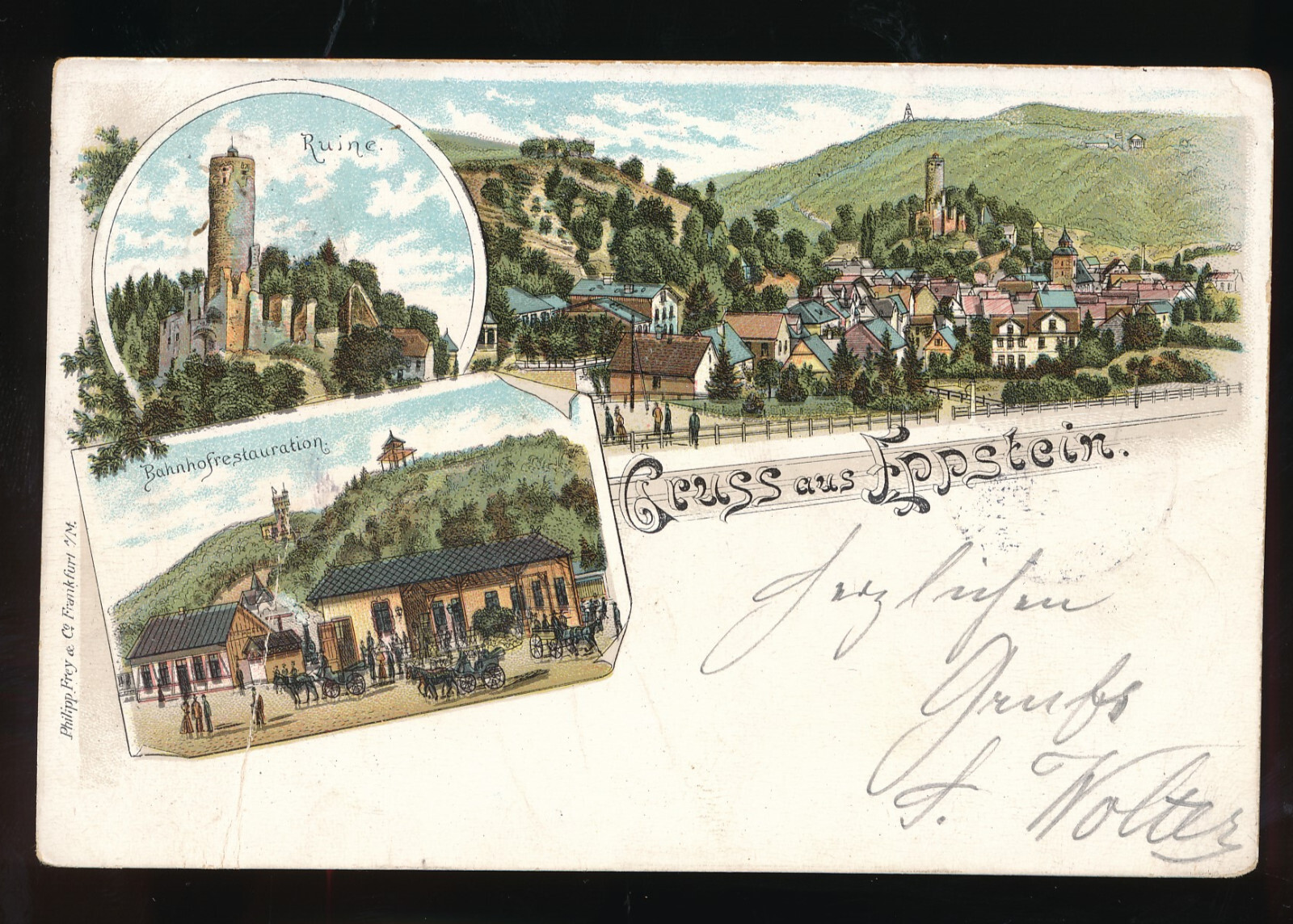 Litho-Karte gruss aus Eppstein Hessen mit Bahnhofrestauration (522)