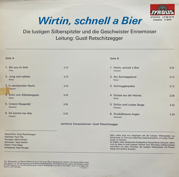 LP / Die Lustigen Silberspitzler Und Die Geschwister Ennemoser – Wirtin, Schnell A Bier
