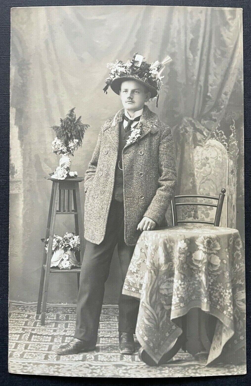 Porträt Mann Anzug Krawatte Jacke Tracht Bart Hut Blumen Tisch 400315 TH