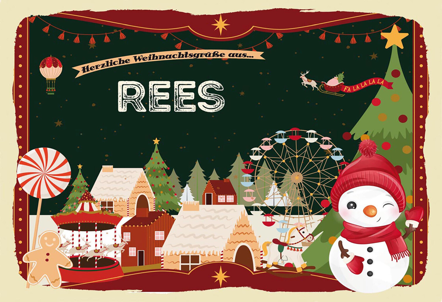 Schild Spruch Herzliche Weihnachtsgrüße aus Rees Comic Schneemann JW