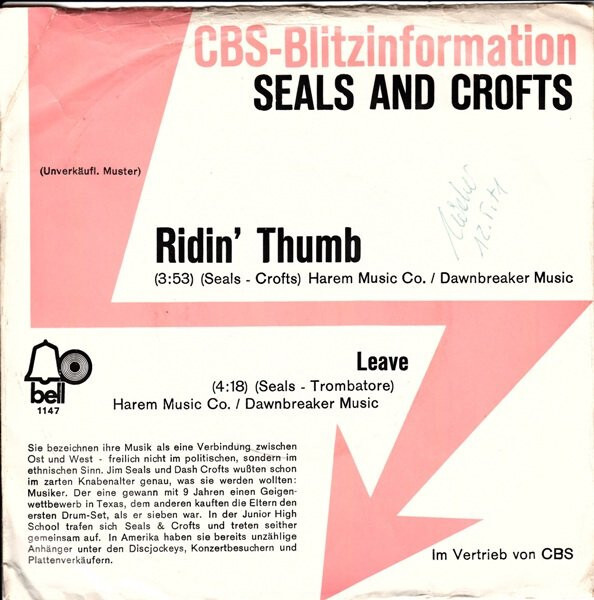 Seals & Crofts - Ridin' Thumb (7", Single, Promo)