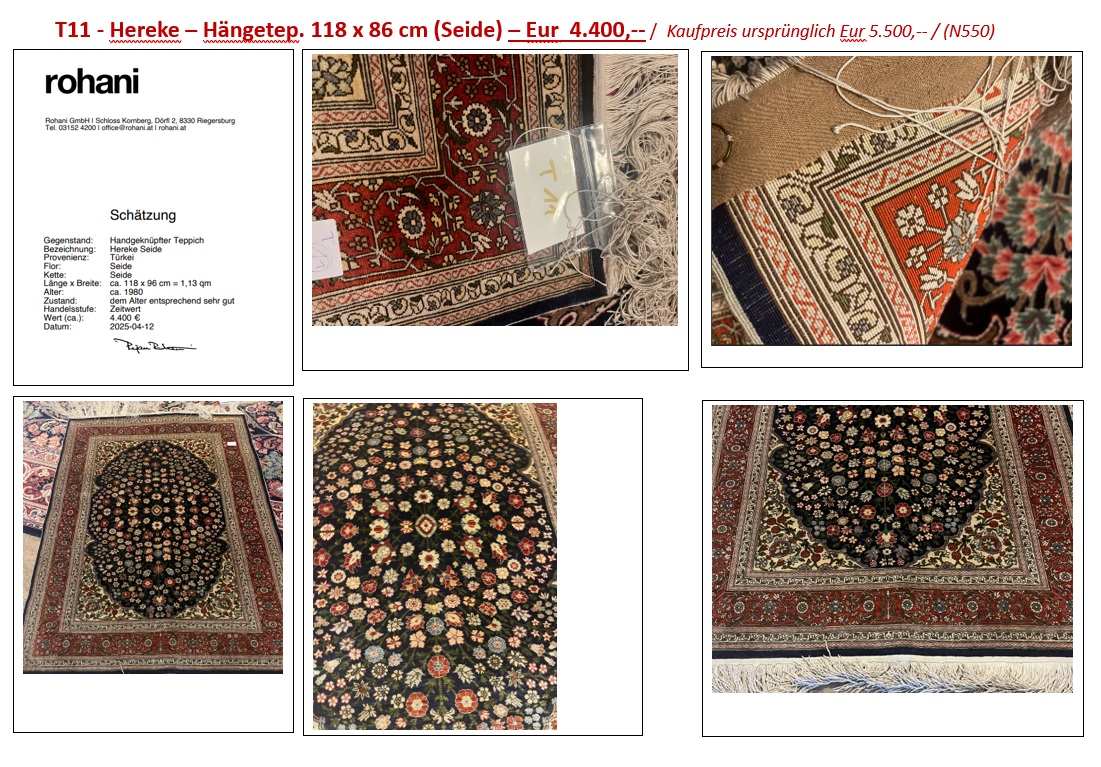 Gegenstand: Handgeknüpfter Teppich Bezeichnung: Hereke Seide Provenienz: Türkei Flor: Seide Kette: Seide Länge x Breite: ca. 118 x 96 cm = 1,13 qm Alter: ca. 1980 Zustand: dem Alter entsprechend sehr gut Handelsstufe: Zeitwert Wert (ca.): 4.400 € Datum: 2025-04-12